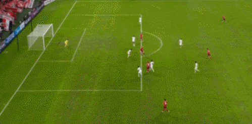 罗慕洛开出左侧角球精准送至后点,杨帅高高跃起头球摆渡到禁区中央。