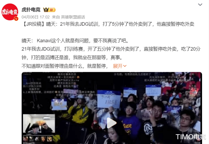 要知道,当时训练赛对面是TES全队,加上JDG自己的队员,整整九个人干坐在电脑前,就等Kanavi一个人吃完这顿20分钟的外卖。在职业电竞这样一个极度看重训练效率和团队纪律的领域,让九个人等一个人吃饭,这样的操作只能用“离谱”来形容。