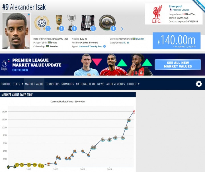 德转管理员表示:“所有人都认为伊萨克的转会费将打破英超纪录,事实果然如此。这名瑞典前锋以1.45亿欧元基础转会费登陆安菲尔德,其市场价值随之升至1.4亿欧元。