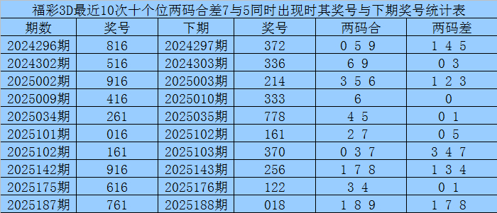 十个位合差分析:上期奖号十个位开出61组合,两码合为7,两码差为5,最近10次十个位两码合7与两码差5同时出现时,其奖号和下期奖号分别为: