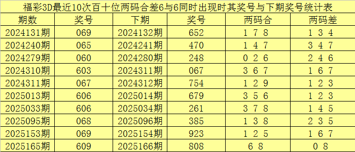 百十位合差分析:上期奖号百十位开出06组合,两码合为6,两码差为6,最近10次百十位两码合6与两码差6同时出现时,其奖号和下期奖号分别为: