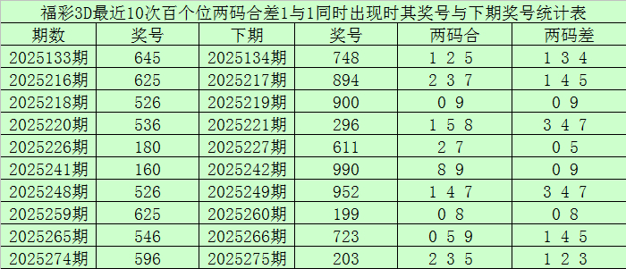 百个位合差分析:上期奖号百个位开出01组合,两码合为1,两码差为1,最近10次百个位两码合1与两码差1同时出现时,其奖号和下期奖号分别为: