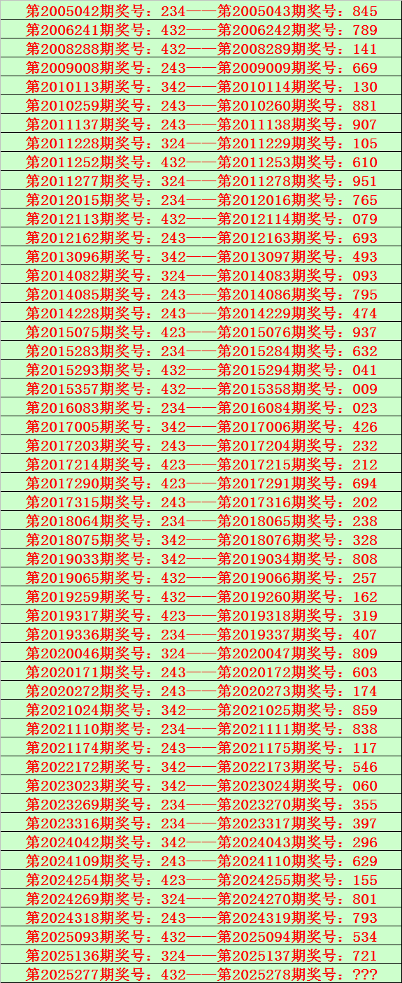 开奖回顾:体彩排列三第2025277期奖号为:432,类型:组六。