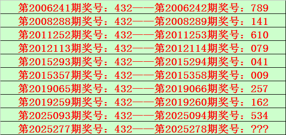 排列三第2025277期开出奖号432,该号码直选类型历史上出现了10次,前9次开出之后期下期奖号为:789、141、610、079、041、009、257、162、534,见下表: