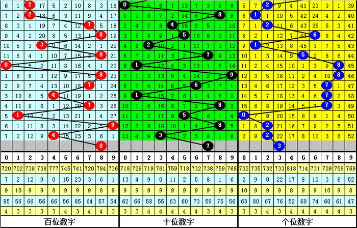 目前个位最冷号码为9,遗漏52期,历史上该号码最大遗漏为52期,本期预计个位号码9继续走冷。